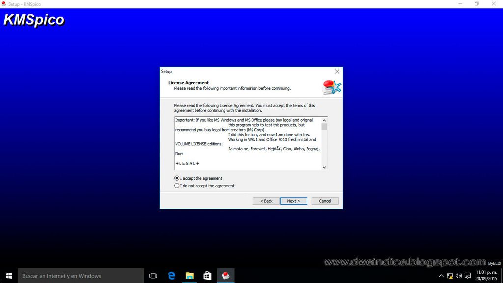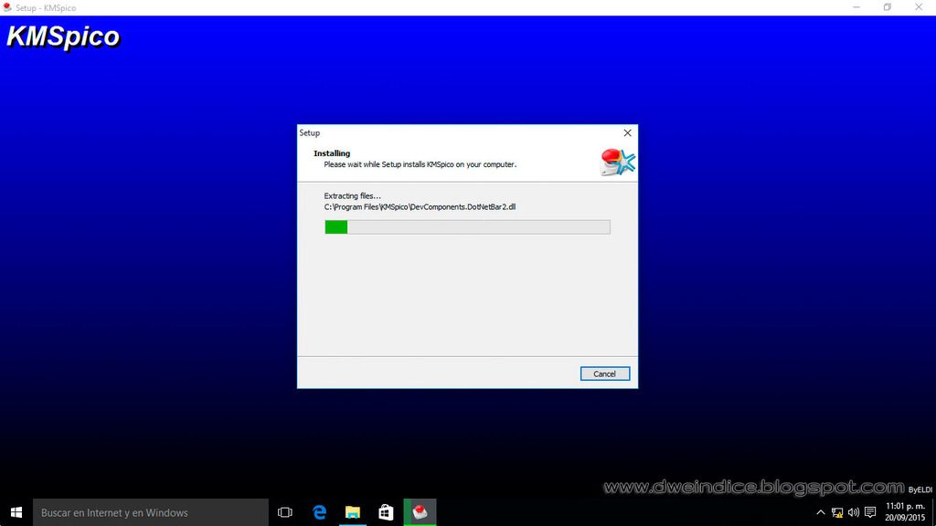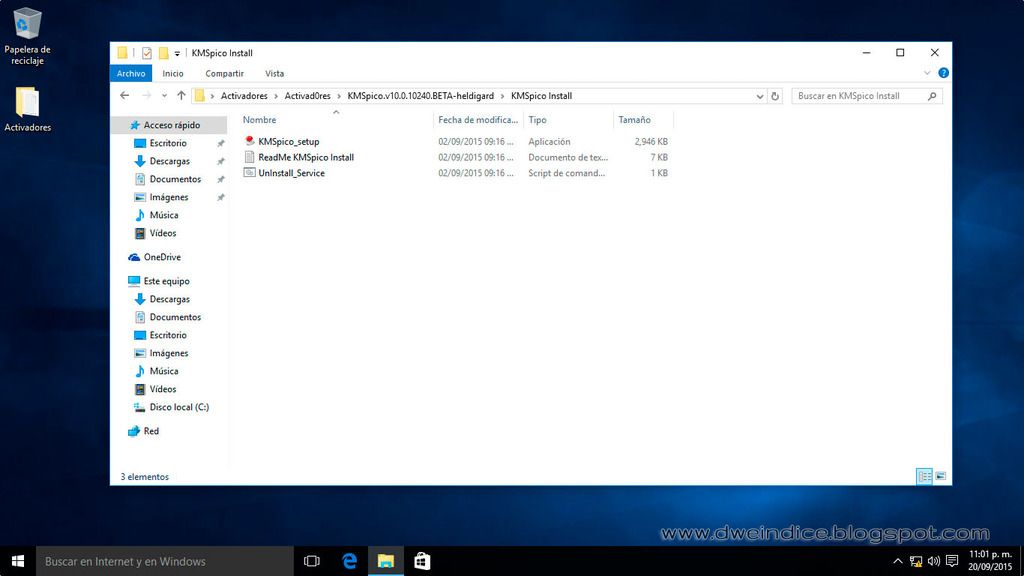 Entra en la carpeta de la siguiente ruta "Activad0res->KMSpico.v.10.0.10240.BETA-heldigard->KMSpico Install", Ejecuta el instalador y sigue las instrucciones.